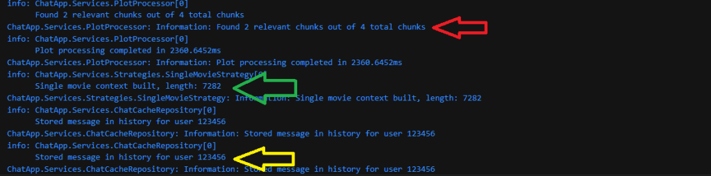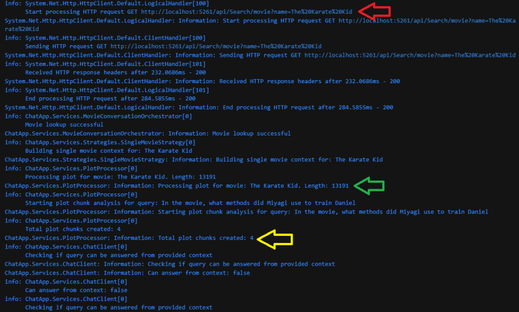 Figure 5. Chat API Logs showing the movie plot being fetched and broken into 4 chunks