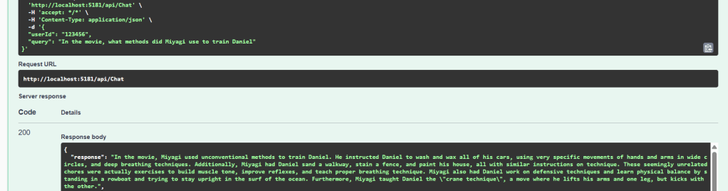 Chat API response: “The main character in the Karate Kid is Daniel Larusso”