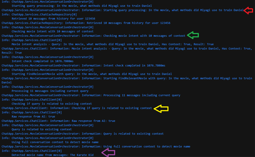 Figure 4. Chat API logs showing the existing conversation being used to identify the movie name